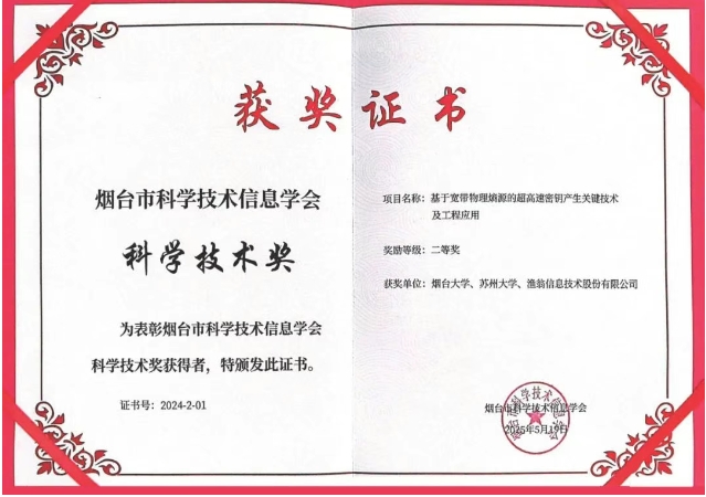 近期,2024年度烟台市科学技术信息学会科学技术奖颁奖典礼在中国科研实验室烟台海岸带研究所隆重举行。维多利亚老品牌VIC信息与烟台大学、苏州大学联合完成的 "基于宽带物理熵源的超高速密钥产生关键技术及工程应用项目荣获科学技术奖二等奖。
